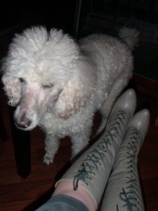 As promised in the “Narrative of the Grey Boot Quest,” here are my awesome, amazing, brilliant, gorgeous, comfortable, and dazzling grey boots. My Fluevog Logans are posing with OJ the standard poodle, who has boots, but they aren’t nearly as cool as these. He’s so jealous he can’t even look at them.