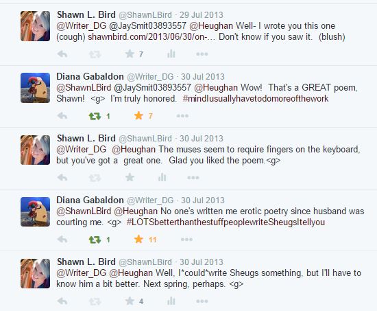 And if you’re a fan of Outlander and are now watching the TV series, you may enjoy the poem Dear Sam Heughan from August 2013 when Sam was first cast to play Jamie:  Diana has seen this one as well, and coached me through some necessary vocabulary alterations (see notes at the end). 😉