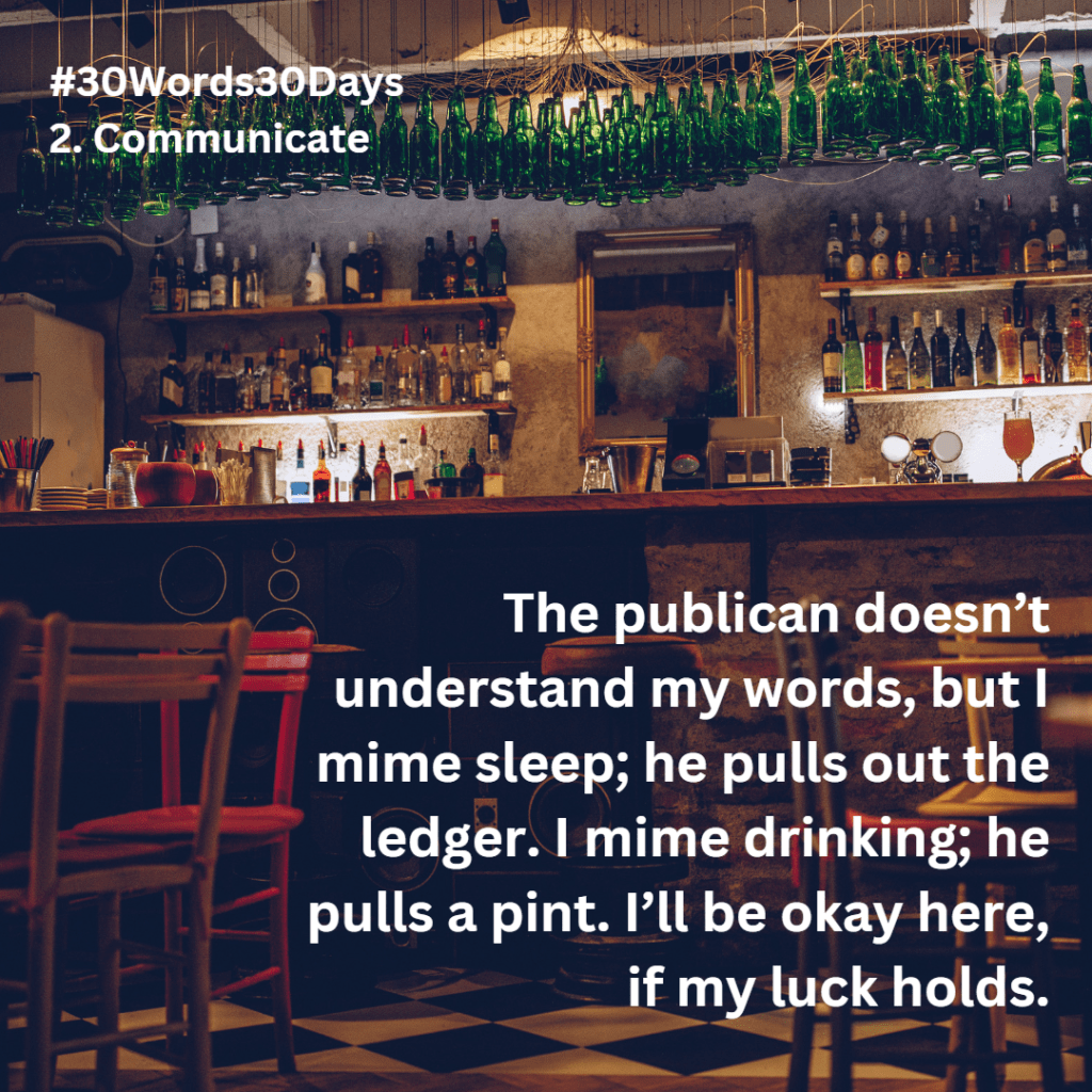 The publican doesn’t understand my words, but I mime sleep; he pulls out the ledger. I mime drinking; he pulls a pint.