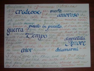 I played with a multi-colour pencil crayon and my calligraphy pens to transcribe this sonnet today.  Here is the result:
