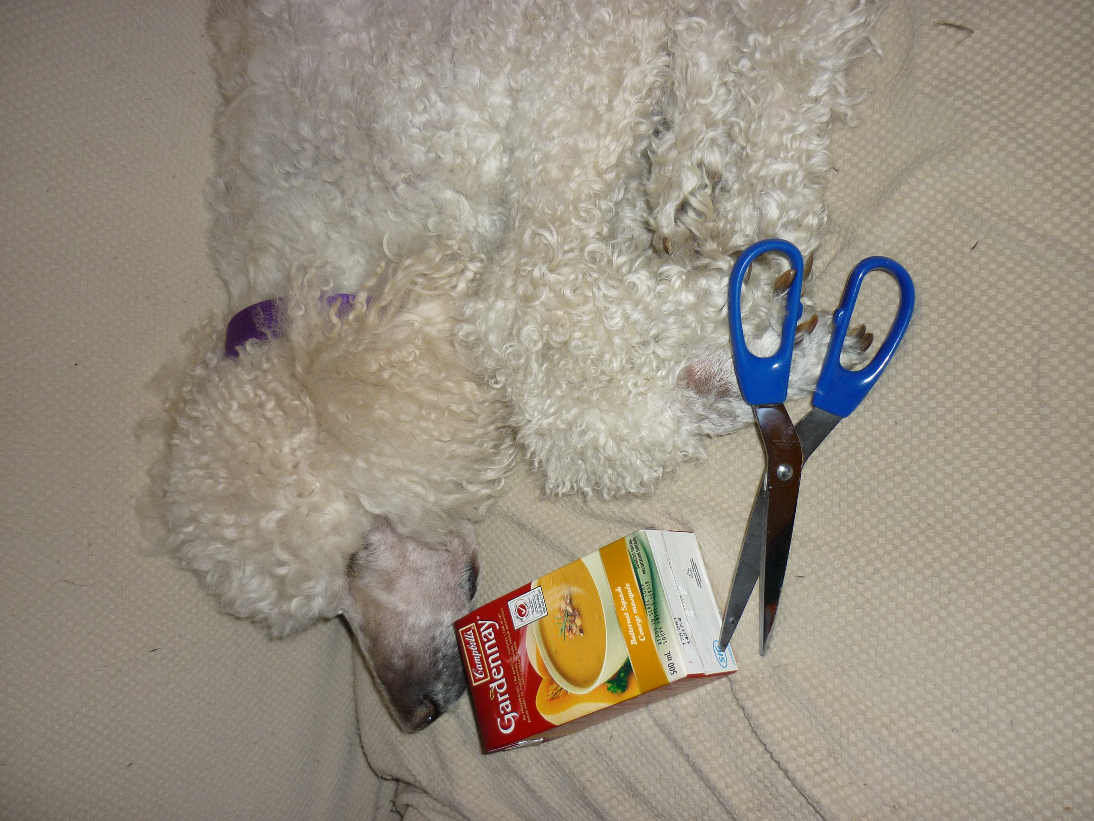 Normally, my husband wakes up first, gets the dogs up, outside and serves them breakfast. Then he locks the two of them in the bedroom with me when he heads off to work. (We endeavour to keep the dogs contained when we aren’t supervising them, for obvious reasons). I am usually awakened by my radio blaring, and open my eyes to find OJ’s nose nearby or Dusty dropping a stinky ball beside my head. Apparently on the day in question, our containment routine was missed. Hubby had neglected to shut the dogs in with me; I guess because he was home and puttering around in the basement and garage.