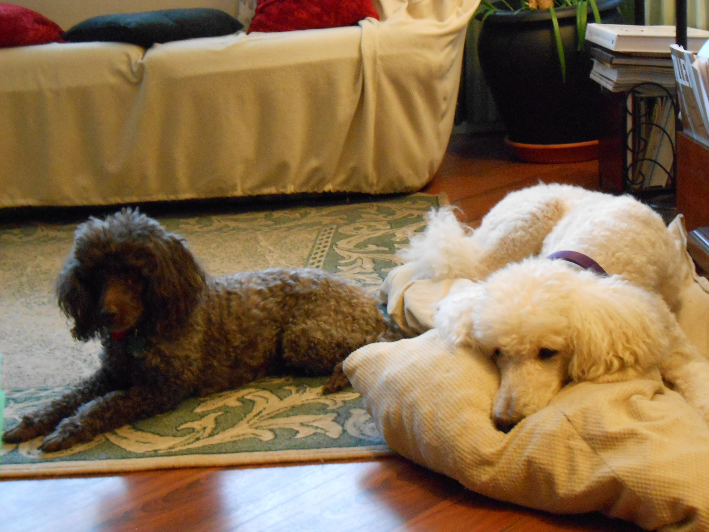 I tend to have the TV on, my notebook computer out, and be reading (or writing) a book well into the wee hours of the morning. The dogs (OJ and Dusty, his mini-poo brother who is much less prone to life threatening idiocy) fall asleep on a couch or their pillows, keeping me company until lock them up for the night when I finally head off to bed. One night, I fell asleep on the couch around 2 a.m. and woke up again at 4 a.m. I staggered down the hall to lock up the dogs in their room, and crashed on my bed. At 8 a.m. I was attacked by a flying poodle.