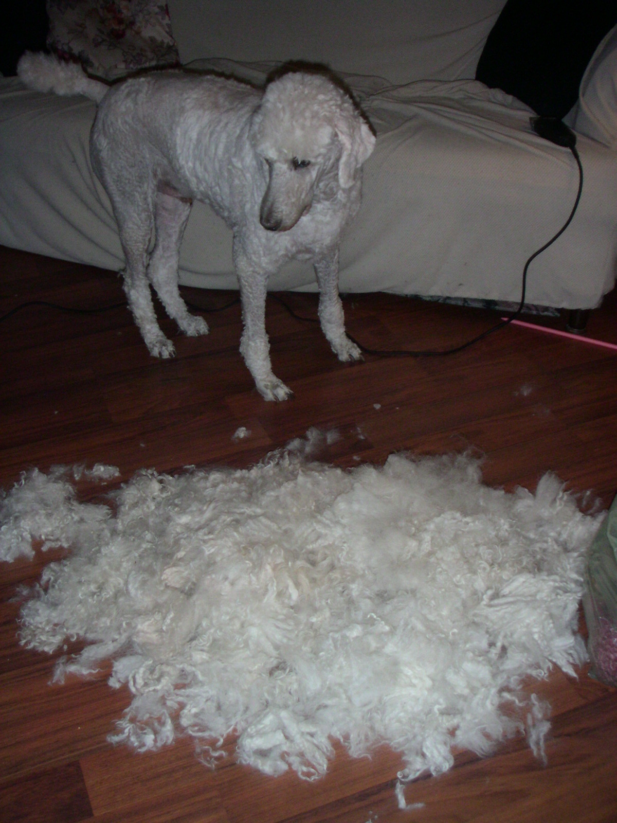 and now he’s ready for the summer, but he looks a lot like a sheep. I left the ‘fleece’ in the picture just because it’s fun to see how much wool comes off! No sweeping required, it all sticks together; I just pick it all up and and stuff it into a bag. OJ looks less like a poodle, but he’s a lot cooler.