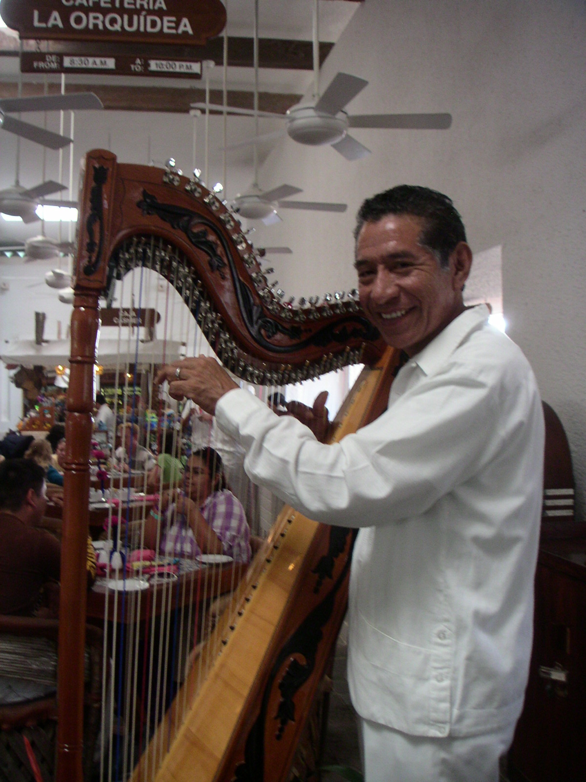I had the privilege to listen to and to meet a talented Mexican harpist last week. He is Guadalupe Torres and he performs regularly at XCaret in Riviera Maya. XCaret is a destination park that offers all sorts of snap shots of Mexican history, flora, fauna, and music. I think Sr Torres’ hour long concert in the Orchid Cafe was the highlight of my week in Mexico. Because I didn’t want to sit in the cafe (I didn’t have any money to buy even a coffee) I stood near his playing platform and watched up close as he played. (Nothing too intense, having someone stare at you from 2 feet away while you play!) Torres was not amplified and the cafe was very loud, so I think I may have been the only one who could hear anything at all.